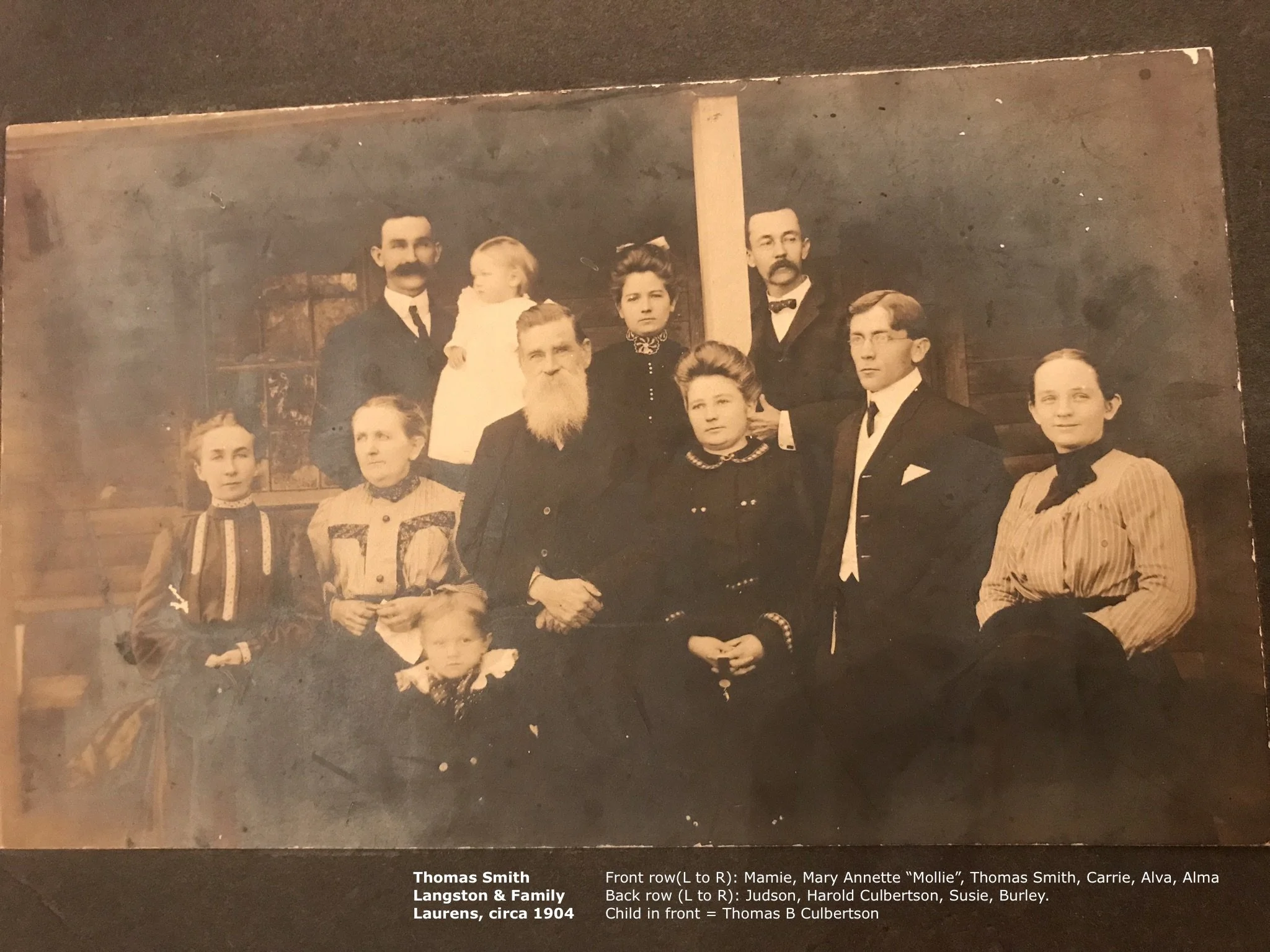 Sarah Murphy Langston owned at least four slaves herself, somewhat atypical for women in those times. Her husband Henry Langston owned at least four more enslaved people as well; one we know was named Adam. Henry and Sarah’s son, William Henry Langston enslaved thirteen people. He was a prominent member of New Prospect Baptist Church, where several of our Langston relatives are buried. He served as probate judge in Laurens for decades, and the only remaining picture we have of him shows a man of stern judicial mien. He served as a private in the Confederate army, as did his son, Thomas Smith Langston, the father of Alva.