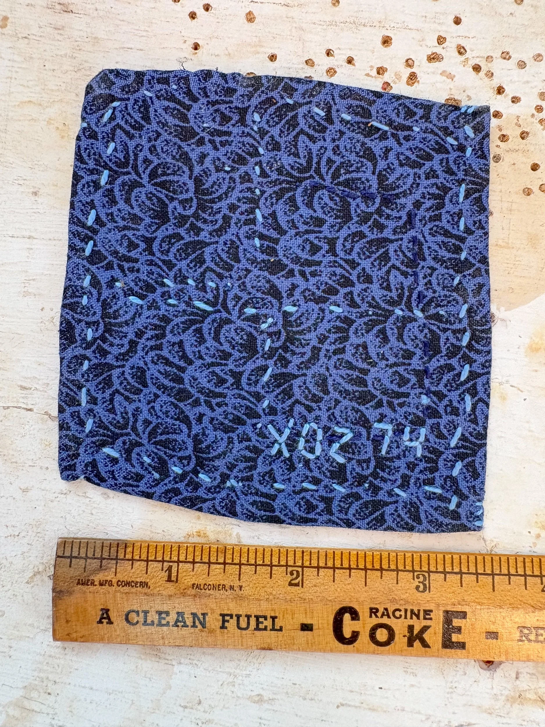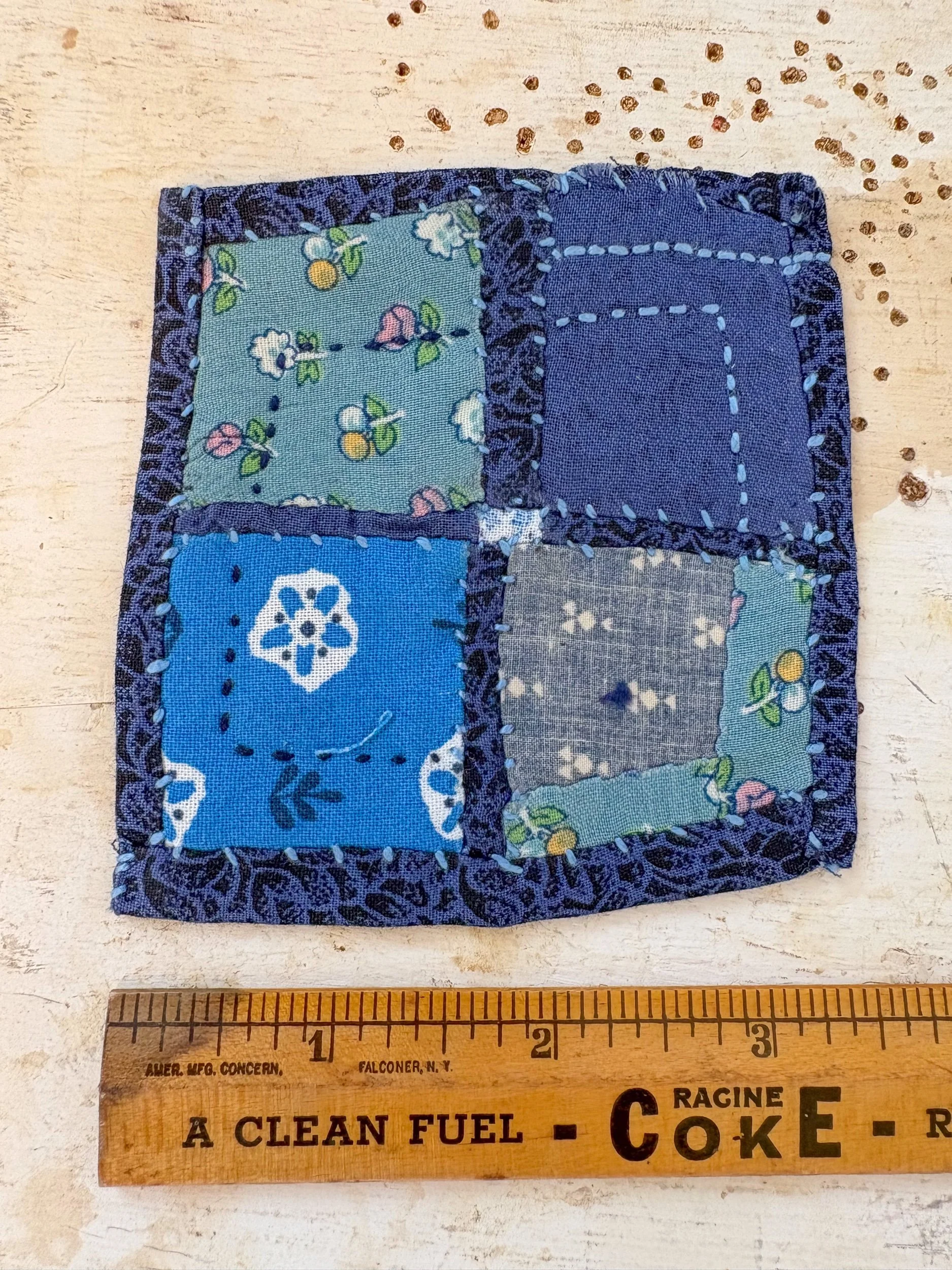 I made my first piece of patchwork in the third grade out of blue calicos. I was so excited about what I’d made, as soon as I got home, i turned that patchwork into a pillow, and a love of textiles was born. This piece is a homage to that original piece and the influential role that’s played in my life.