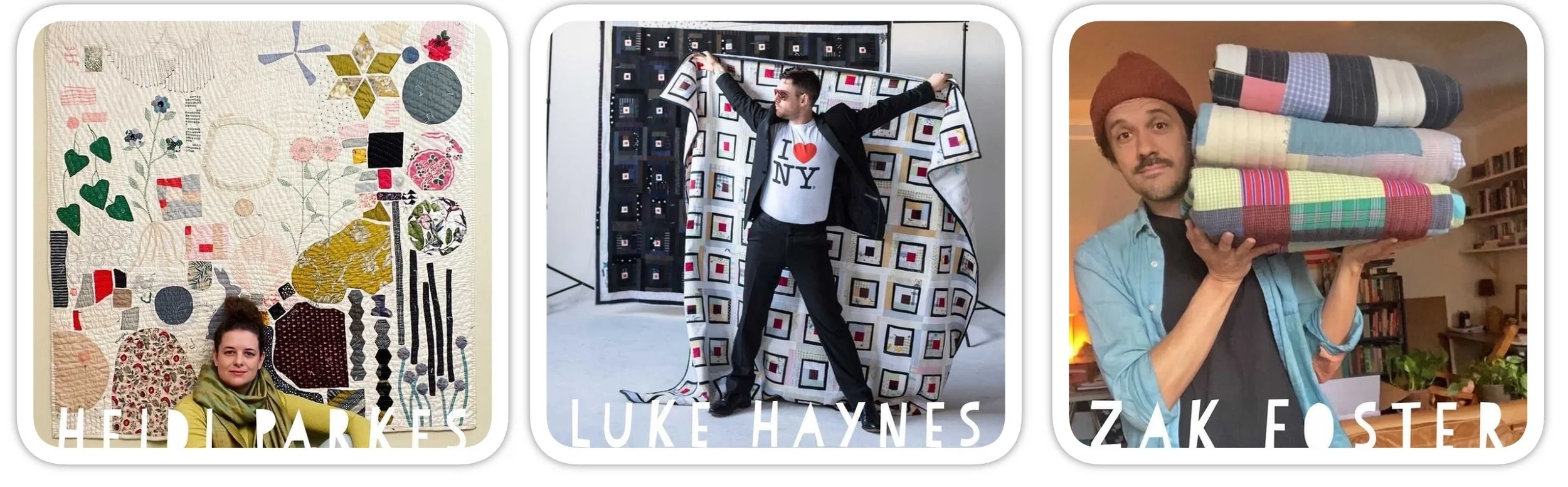 My good friends Heidi Parkes and Luke Haynes and I get together and have an ongoing conversation investigating and celebrating the unique qualities of quilts, including: flexibility, sculpture, softness, and cultural context. You can watch some of my favorites below and find the complete library here.