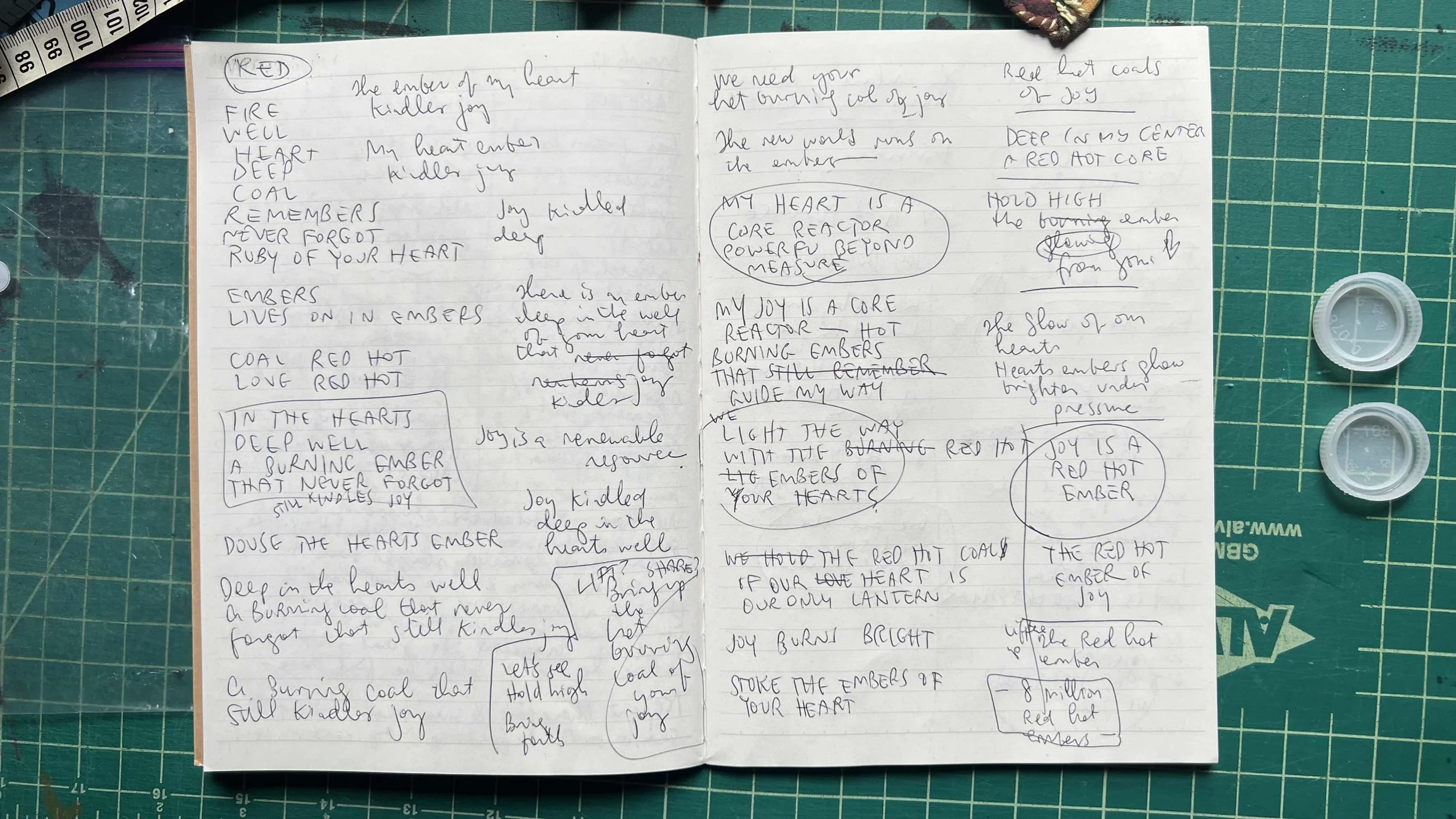 I clarified my intention for many of my quilts through the act of writing. For the EMBER quilt, for example, I had two starting points: color and concept. Colorwise, I found myself one day with too much red in my stash and decided the next quilt would have to be red. With that in mind, and knowing this was going to be part of the NEW APOCALYPSE collection, I did some free-writing to clarify my personal associations with the future and the color red. You can see how my thoughts evolved as I wrote in this snapshot from my journal.